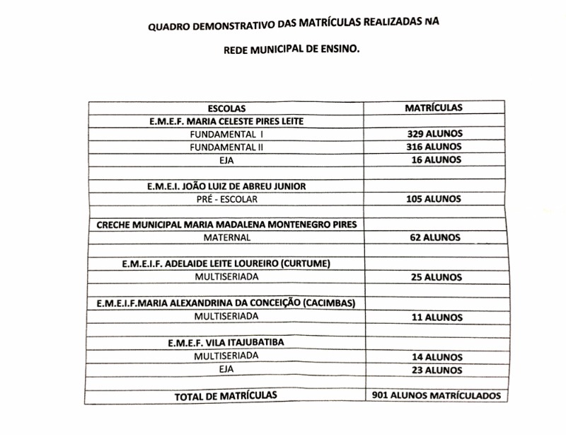 “Abrimos a creche em tempo integral e conseguimos chegar a 65 matriculas. Infelizmente, o espaço é pequeno e não suposta mais alunos. Na escola, conseguimos chegar a mais de 900 matriculas. O fundamental I, do 1º ao 5º ano, funcionará só pela manhã e a tarde funcionará o fundamental II, do 6º ao 9º ano. Já a turma do EJA (Educação de Jovens e Adultos) funcionará no período da noite” informou a secretária