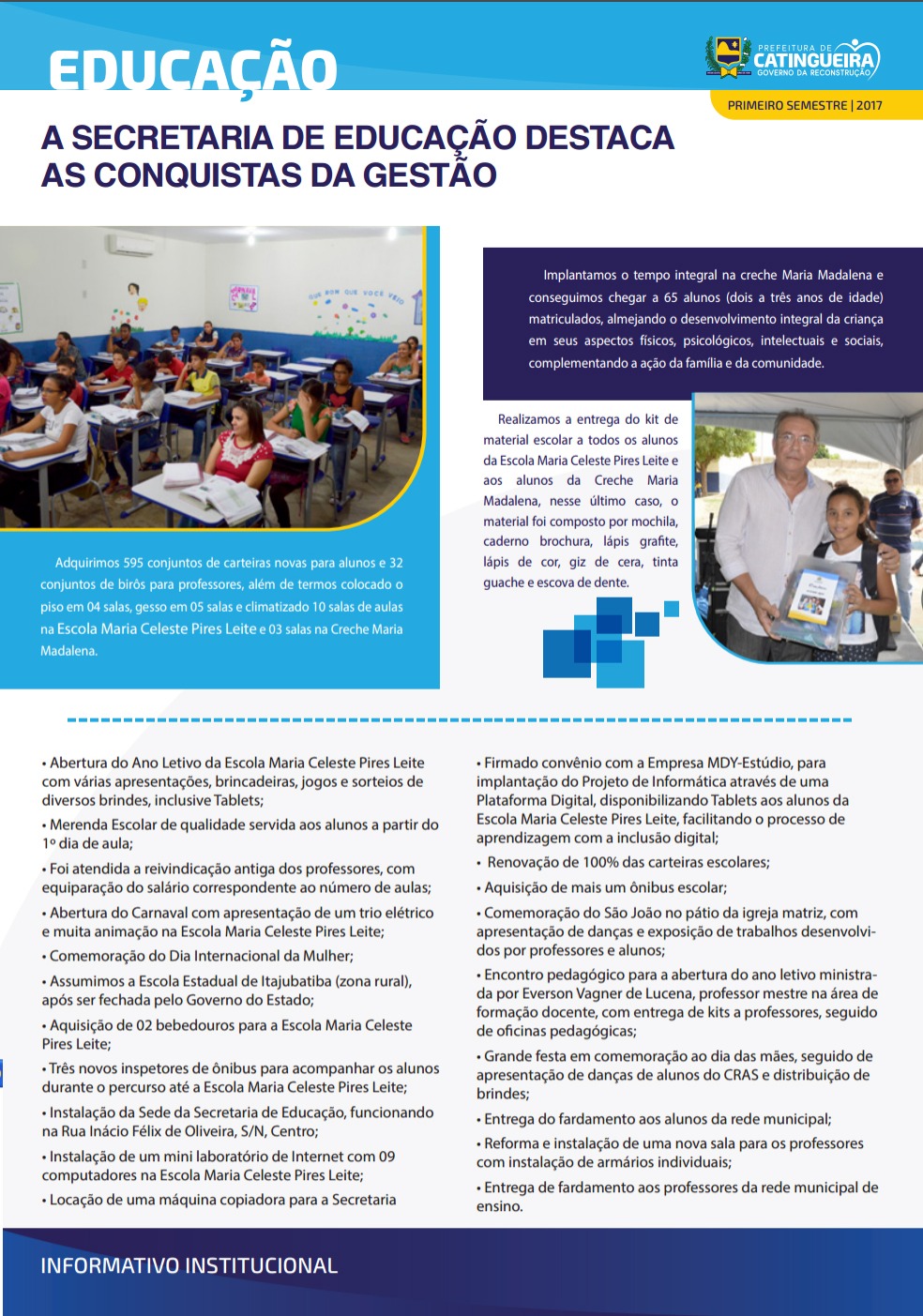“Nós já estamos na frente de vários municípios. Conseguimos começar o ano entregando o material didático e o fardamento a todos os alunos. Tenho certeza que se a gente tivesse dinheiro, nós estaríamos dando um show em Catingueira, mas, assim que os recursos da educação forem desbloqueados, iremos dá a cidade tudo que ela merece. Mesmo assim, também já conseguimos dá um aumento aos professores, também preparamos uma sala muito confortável para os professores. Estamos trabalhando para melhorar a quadra de esportes da escola. Renovamos 100% das carteiras escolares e climatizamos todas as salas de aula. Estamos oferecendo merenda escolar de qualidade, com um cardápio preparado e acompanhado por uma nutricionista. Também inovamos ao oferecer um copo de leite com achocolatado aos alunos da zona rural, já que por muitas vezes os mesmos saem muito cedo de casa sem nenhum tipo de alimento. Esta bebida é oferecida assim que eles chegam na escola” disse.