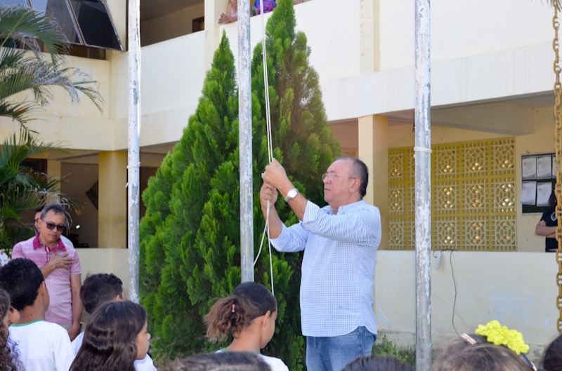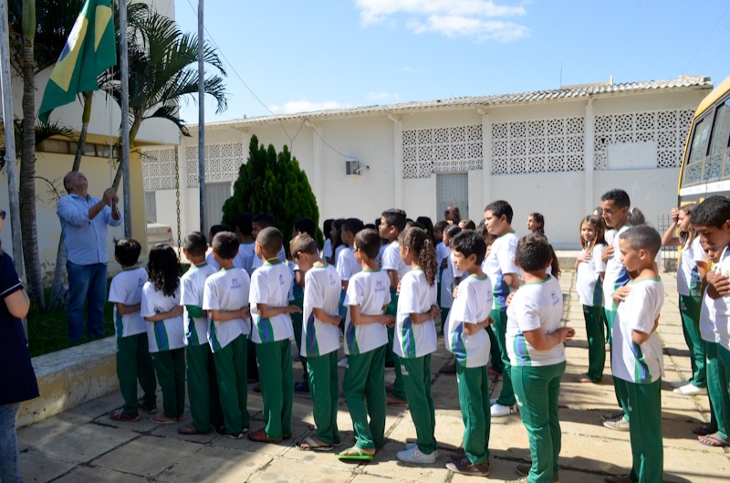 O prefeito Odir Borges realizou o hasteamento da bandeira brasileira ao som do hino nacional, cantado pelos alunos da escola Municipal Maria Celeste Pires Leite.