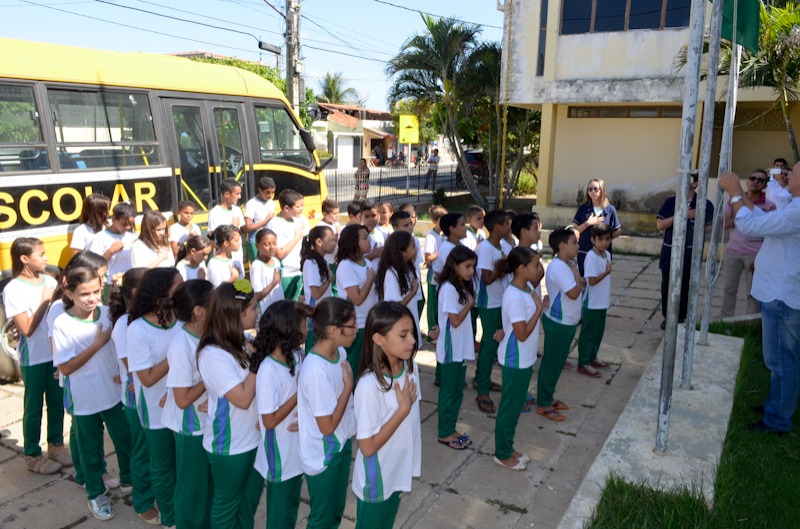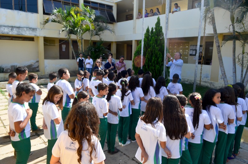 A solenidade aconteceu no pátio da prefeitura municipal e contou com a presença de professores e alunos da rede municipal de ensino, além de secretários.